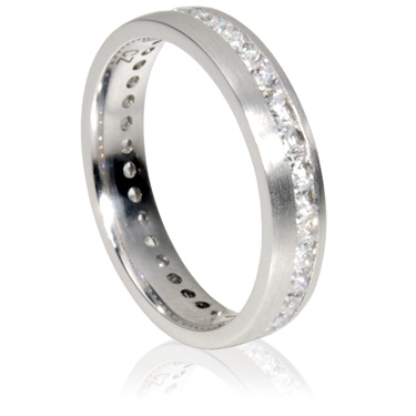 Der Ring ist mit 0,04ct Diamanten im Princess-Cut ausgefasst, also voll umschlossen. Die Diamanten sitzen nahtlos an einander in einem off-centre verlaufenden Kanal. Die matte Oberfläche hebt die Diamanten besonders hervor. ACHTUNG: Dieser Ring kann später nicht geändert werden. Bitte messen Sie die Ringgröße sorgfältig.